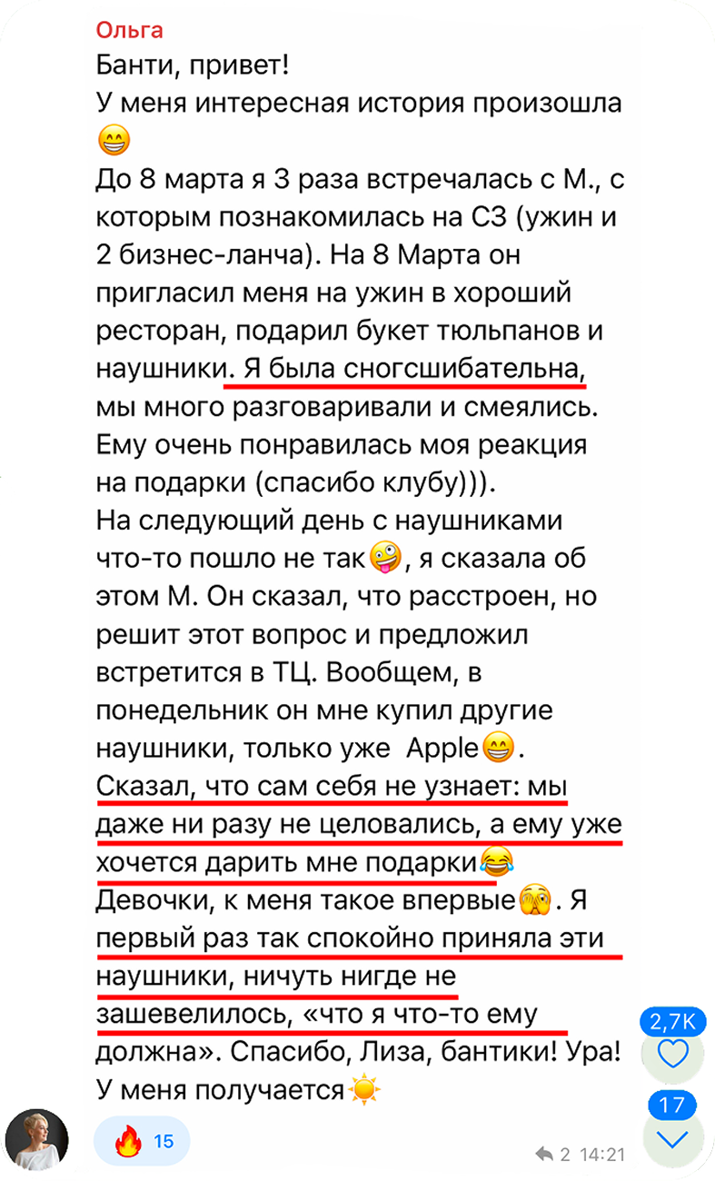 Ты прокачала свою самооценку и не соглашаешься на меньшее, спокойно называешь цену за свою работу и отказываешь, если тебе какой-то вариант не подходит.